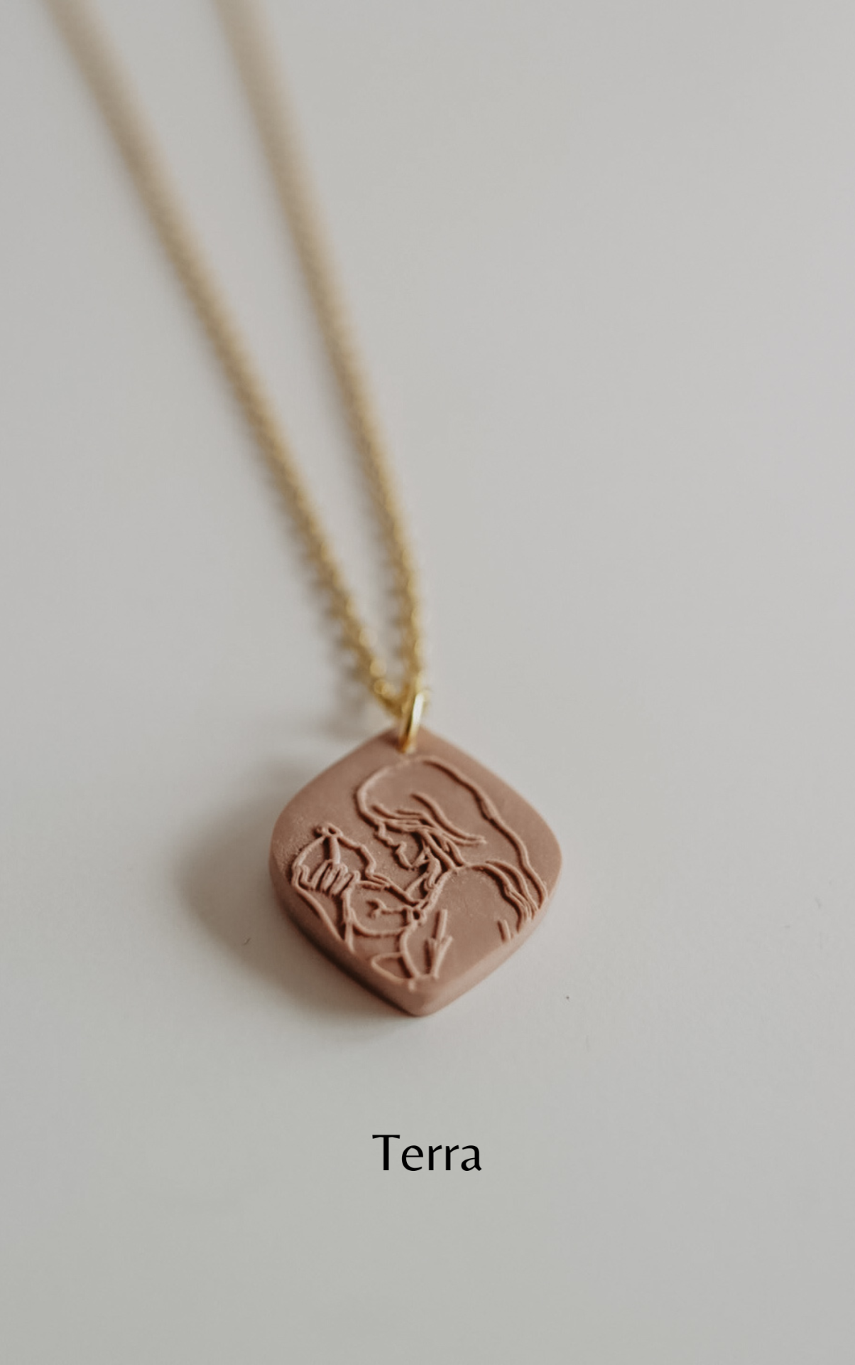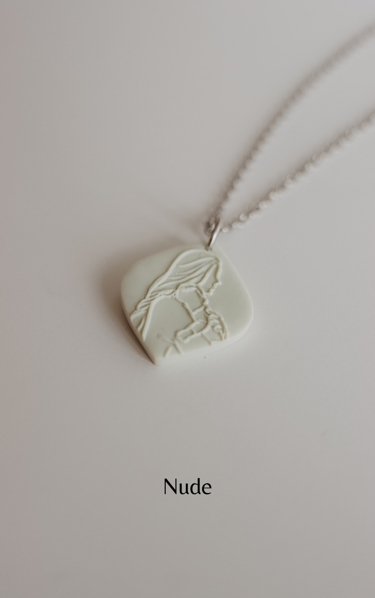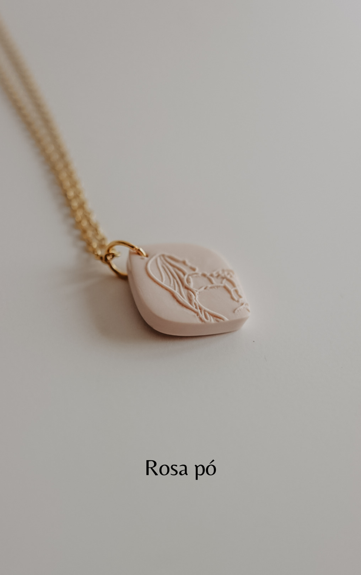 A corrente é em aço inoxidável, pode ser prateada ou dourada, com 45cm de comprimento. O pendente tem cerca de 25 mm de comprimento. Hipoalergénico.