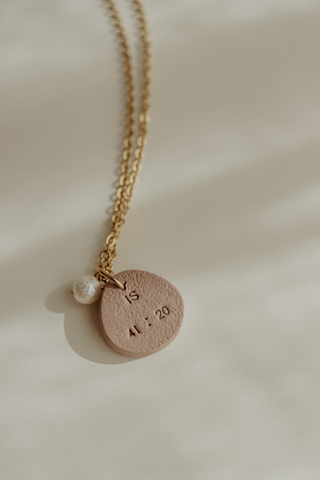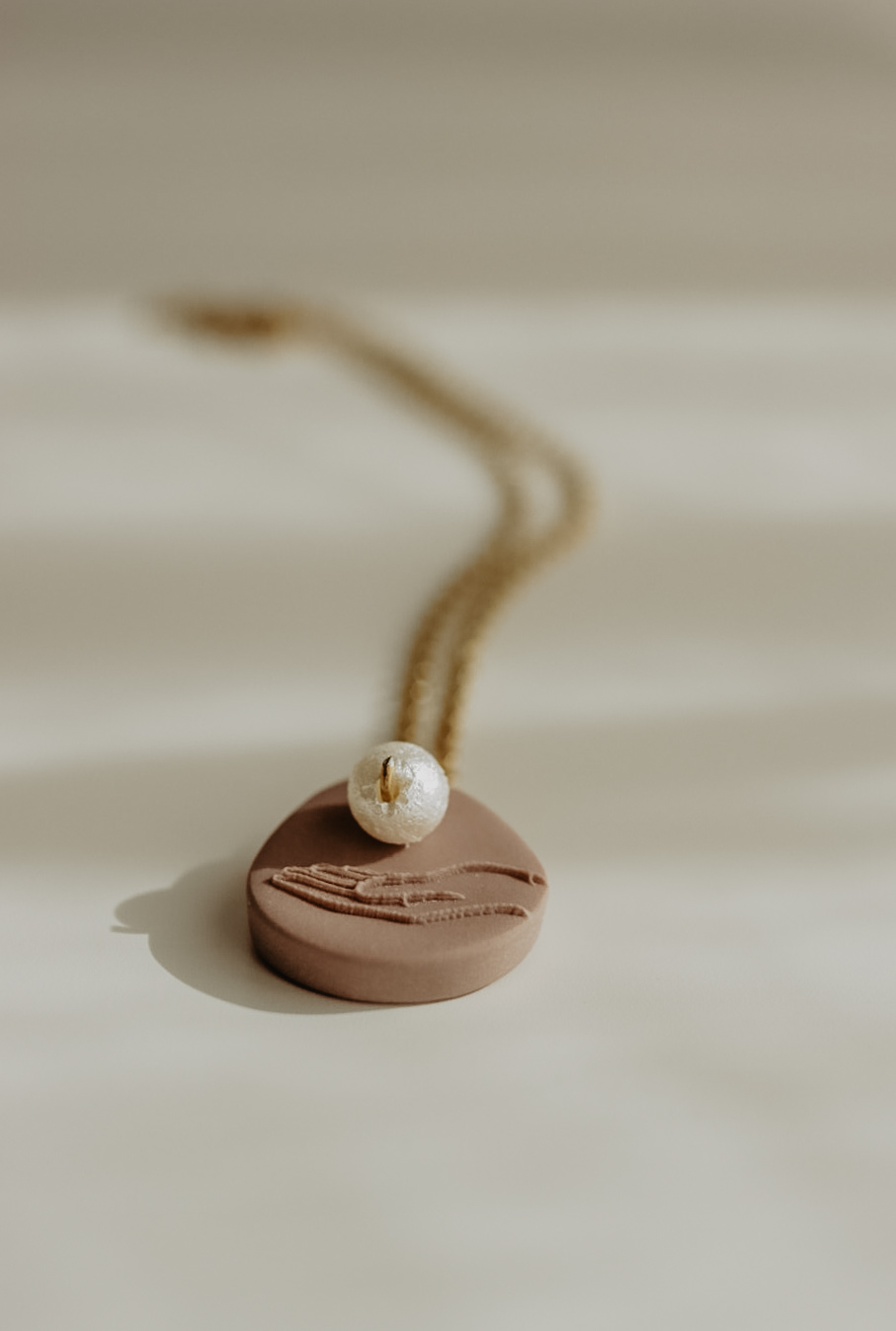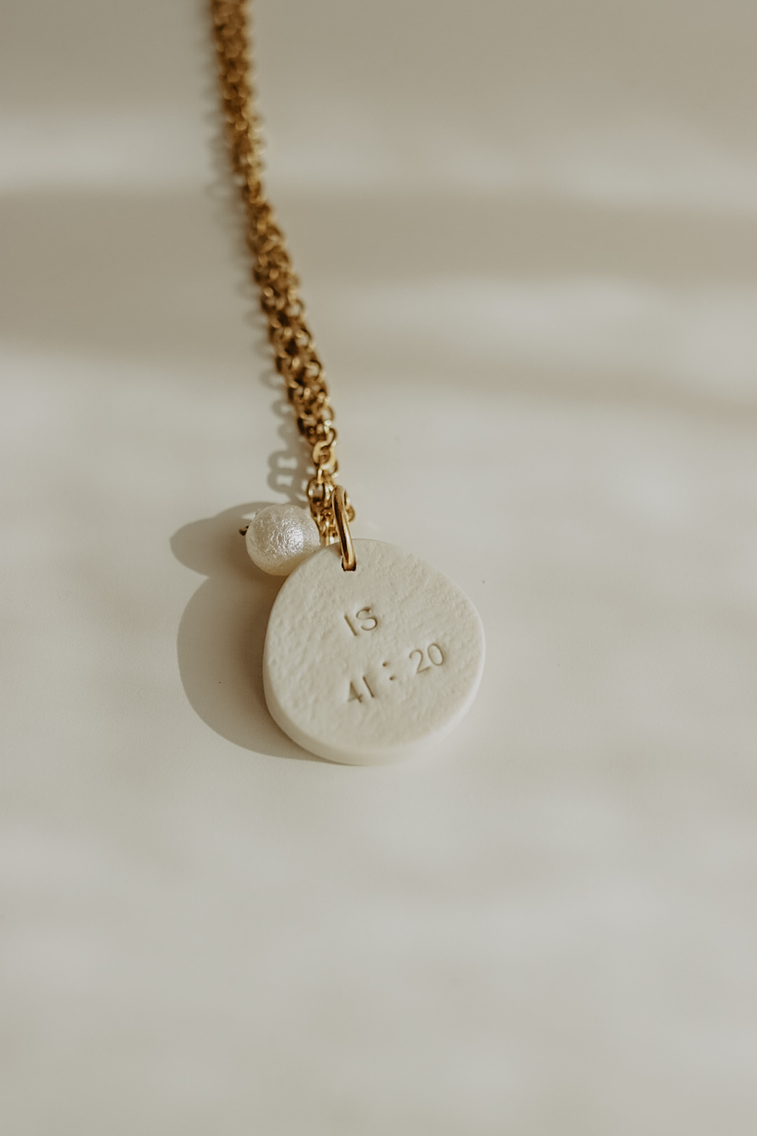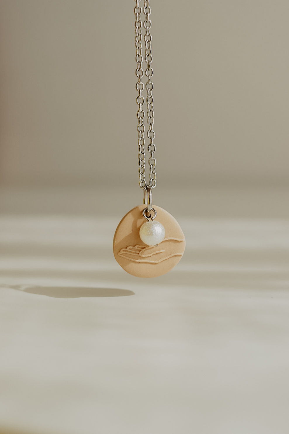 Este pendente tem cerca de 20mm de altura e está disponível em três cores. Numa das faces tem uma mão e um pendente extra em formato de pérola, na outra tem a respetiva referência bíblica.