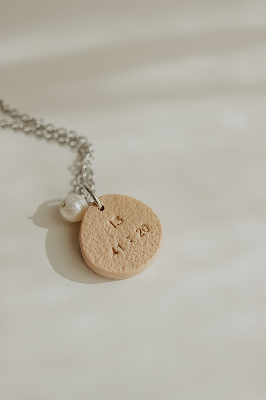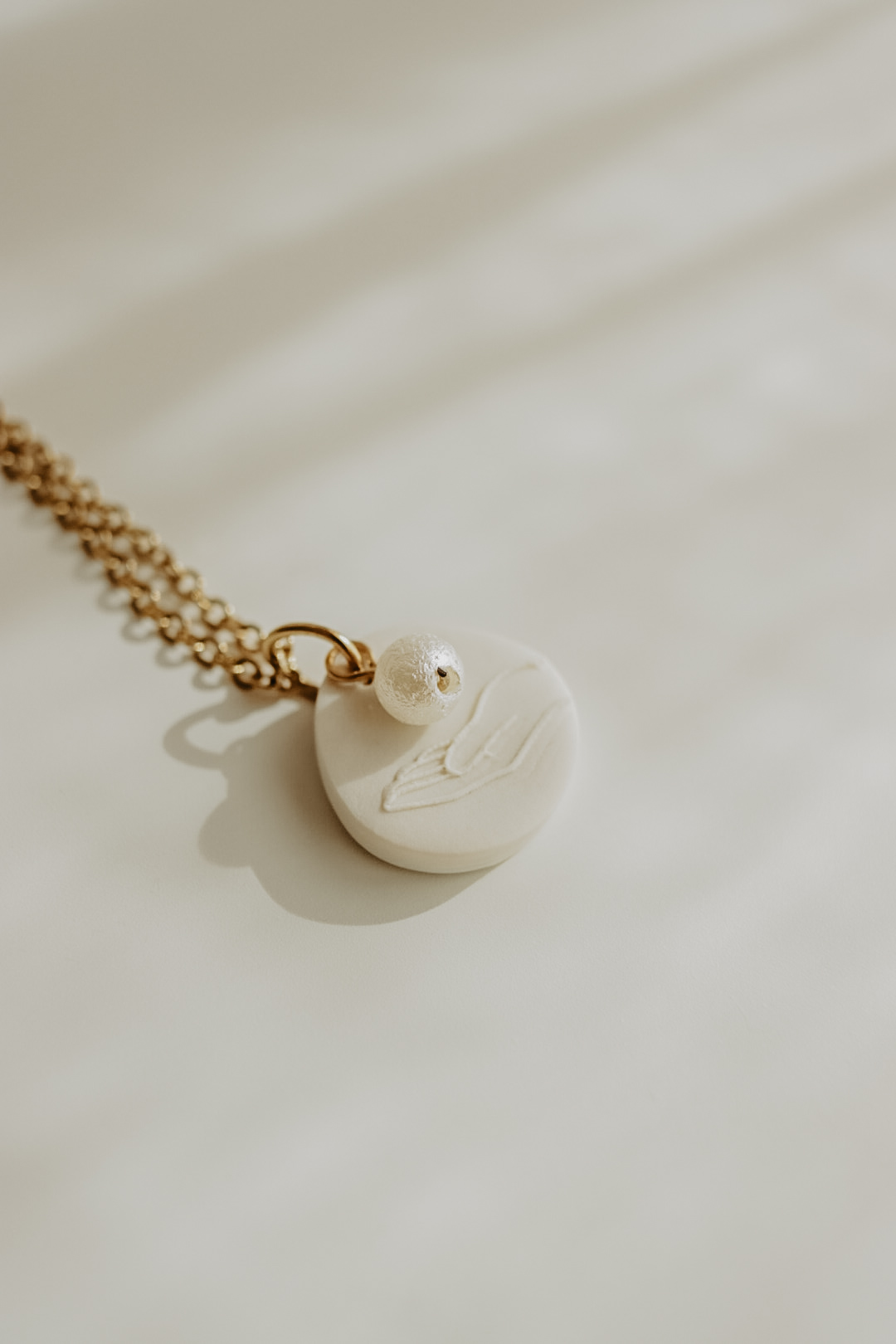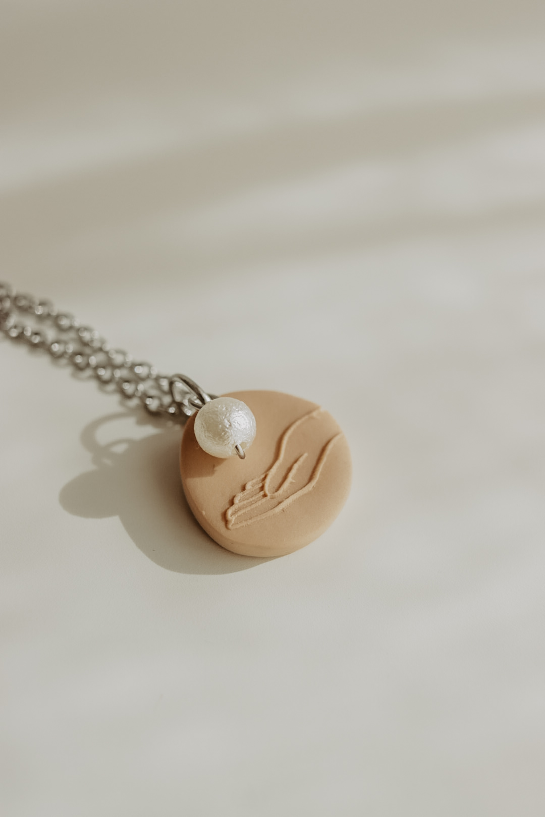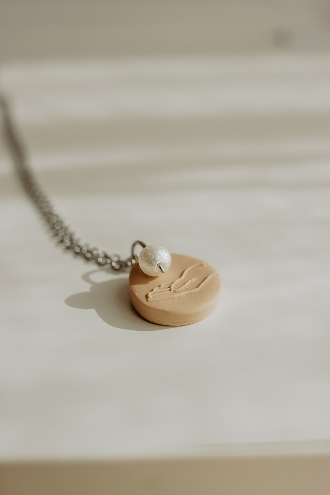 Este pendente tem cerca de 20mm de altura e está disponível em três cores. Numa das faces tem uma mão e um pendente extra em formato de pérola, na outra tem a respetiva referência bíblica.