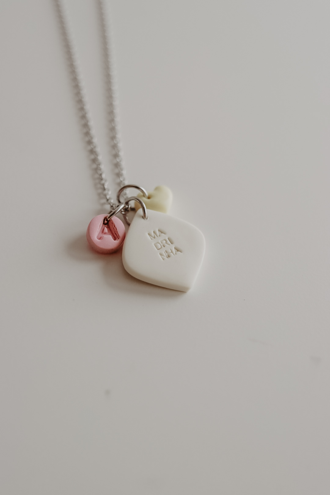 Este pendente tem cerca de 20mm de altura e é acompanhado por uma inicial e/ou um coração. As cores disponíveis para as iniciais e corações são: