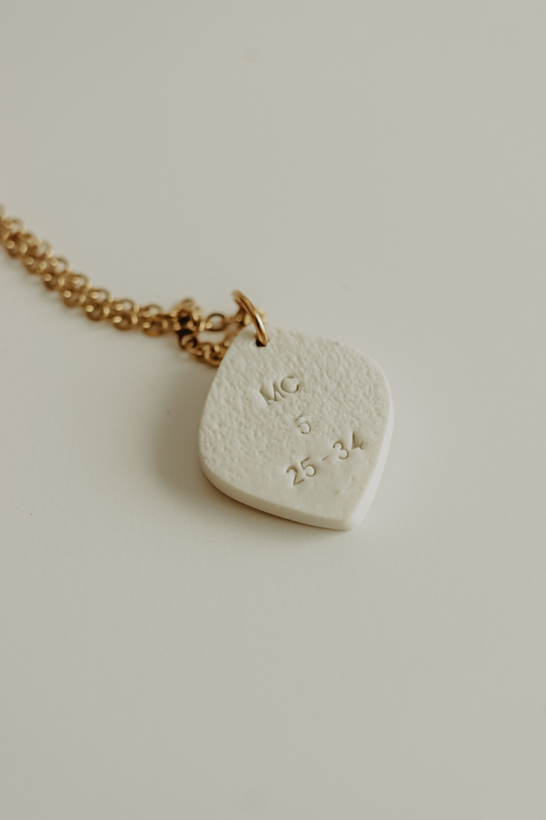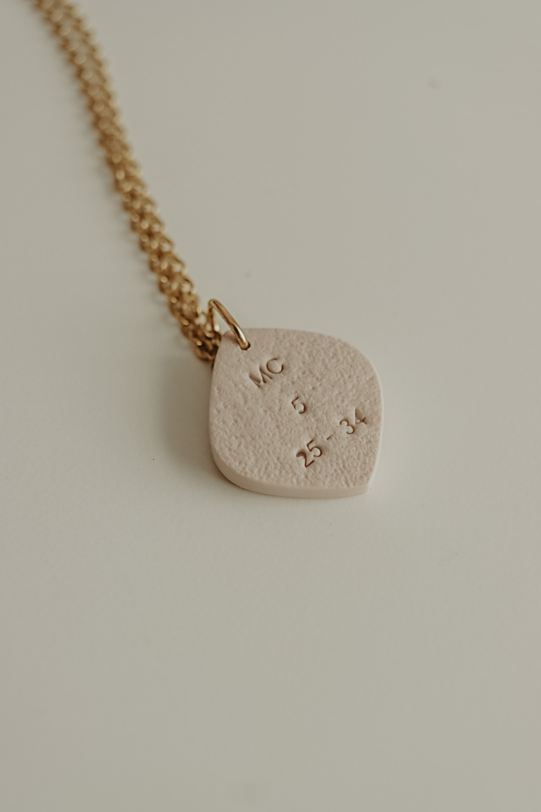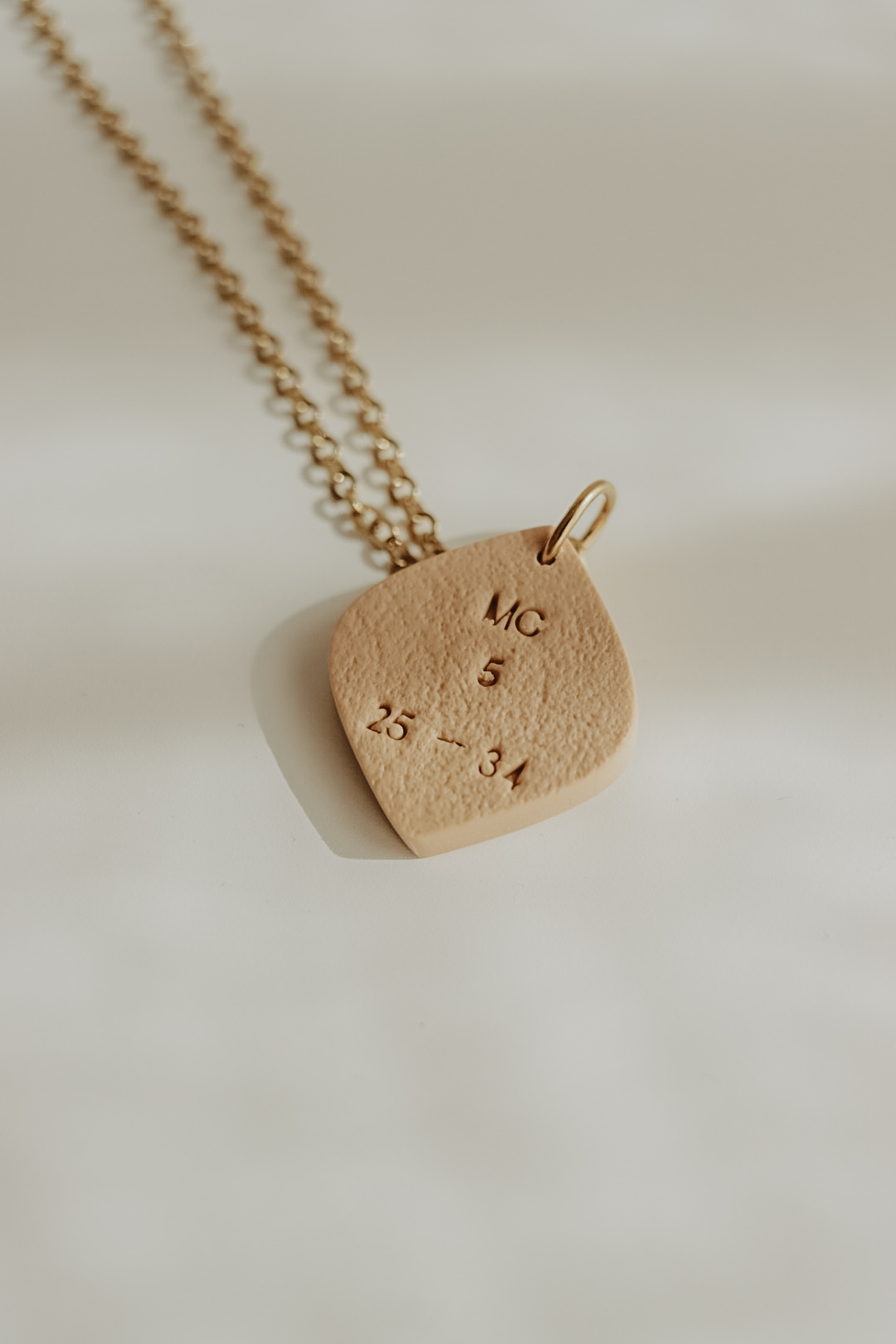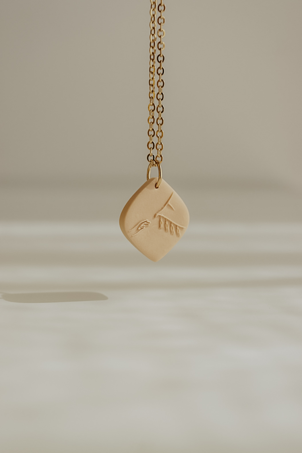 Este pendente tem cerca de 20mm de altura e está disponível em três cores. Numa das faces tem a imagem de uma mão a tocar as franjas de um manto, na outra face tem a respetiva referência bíblica.