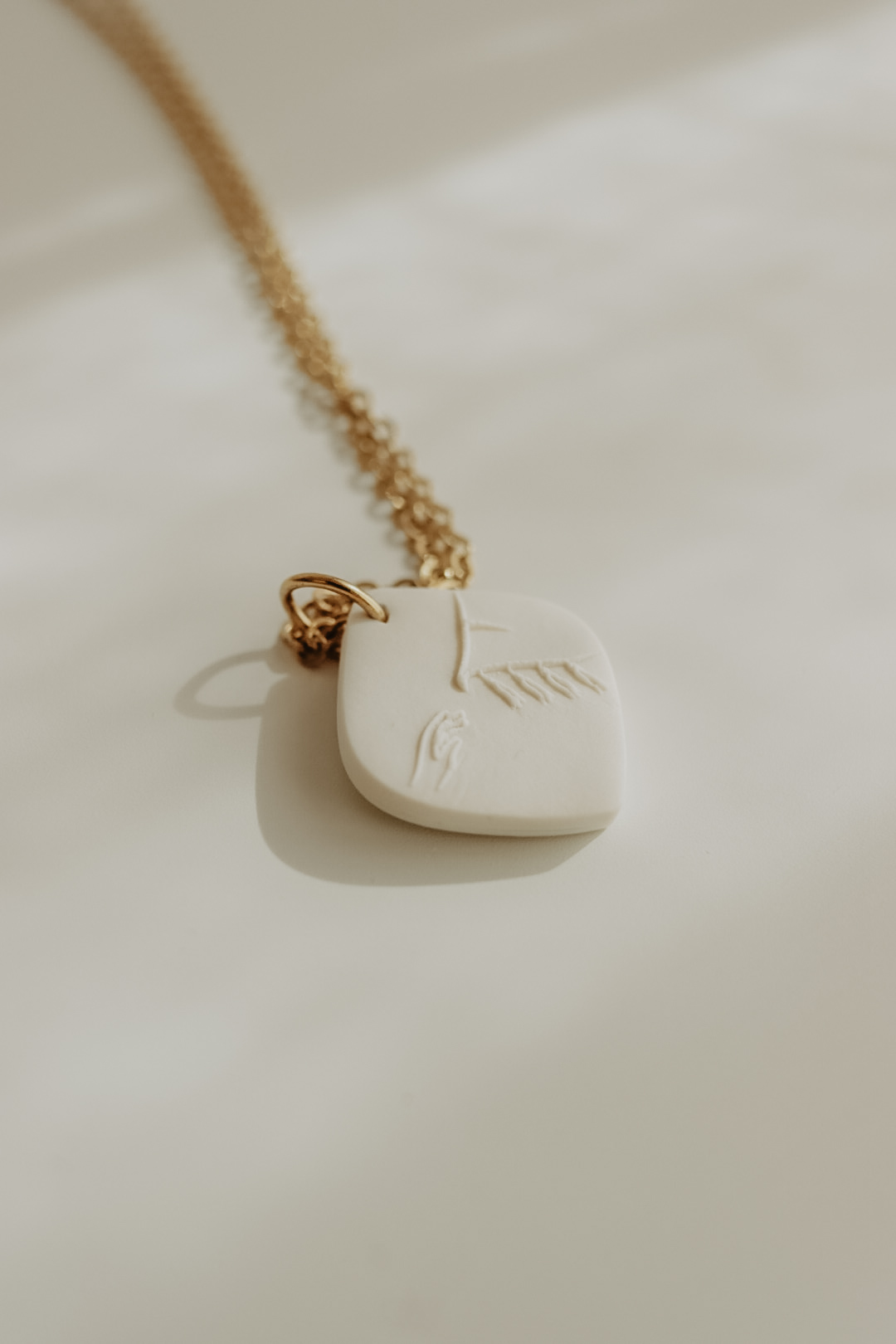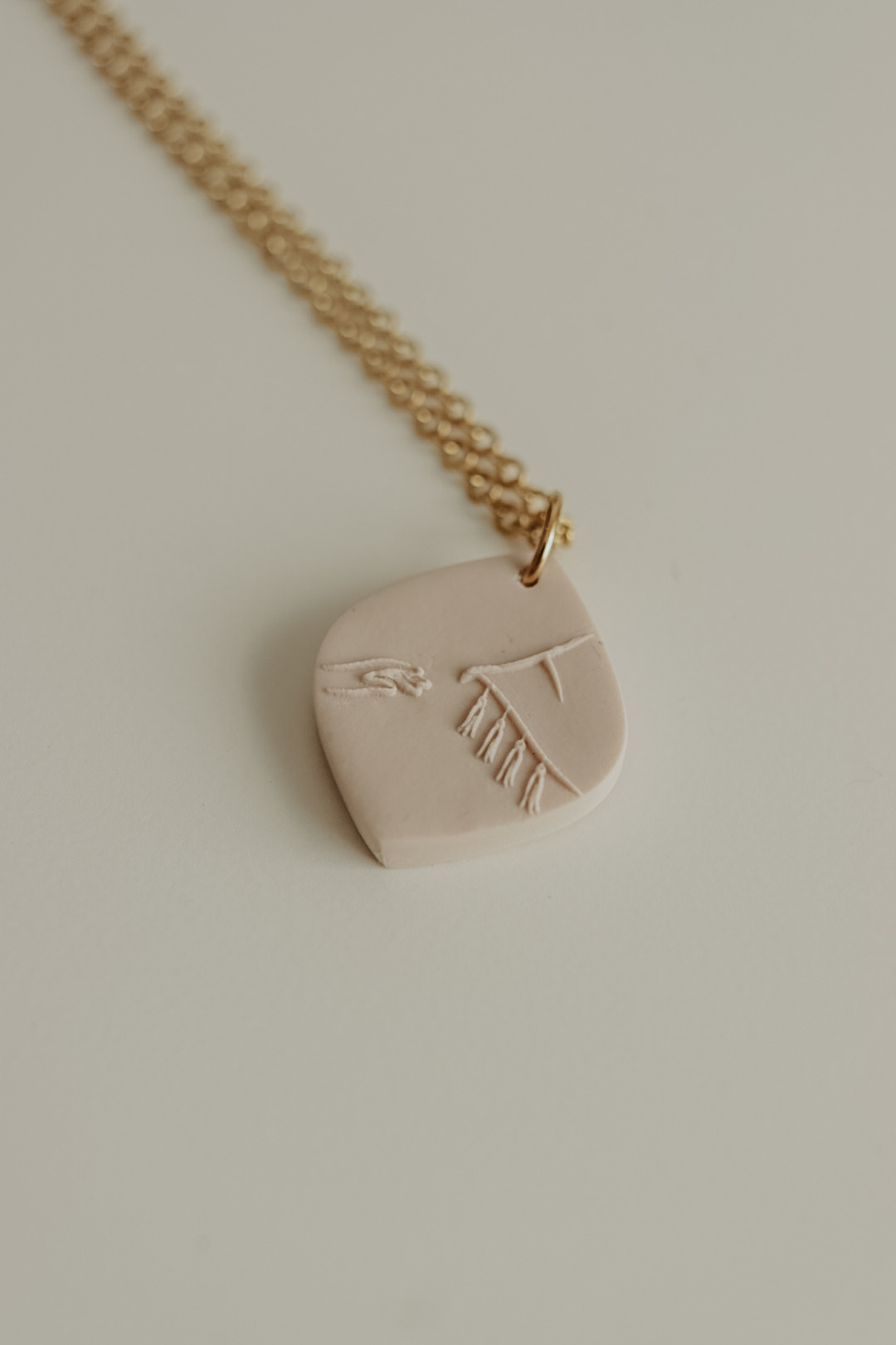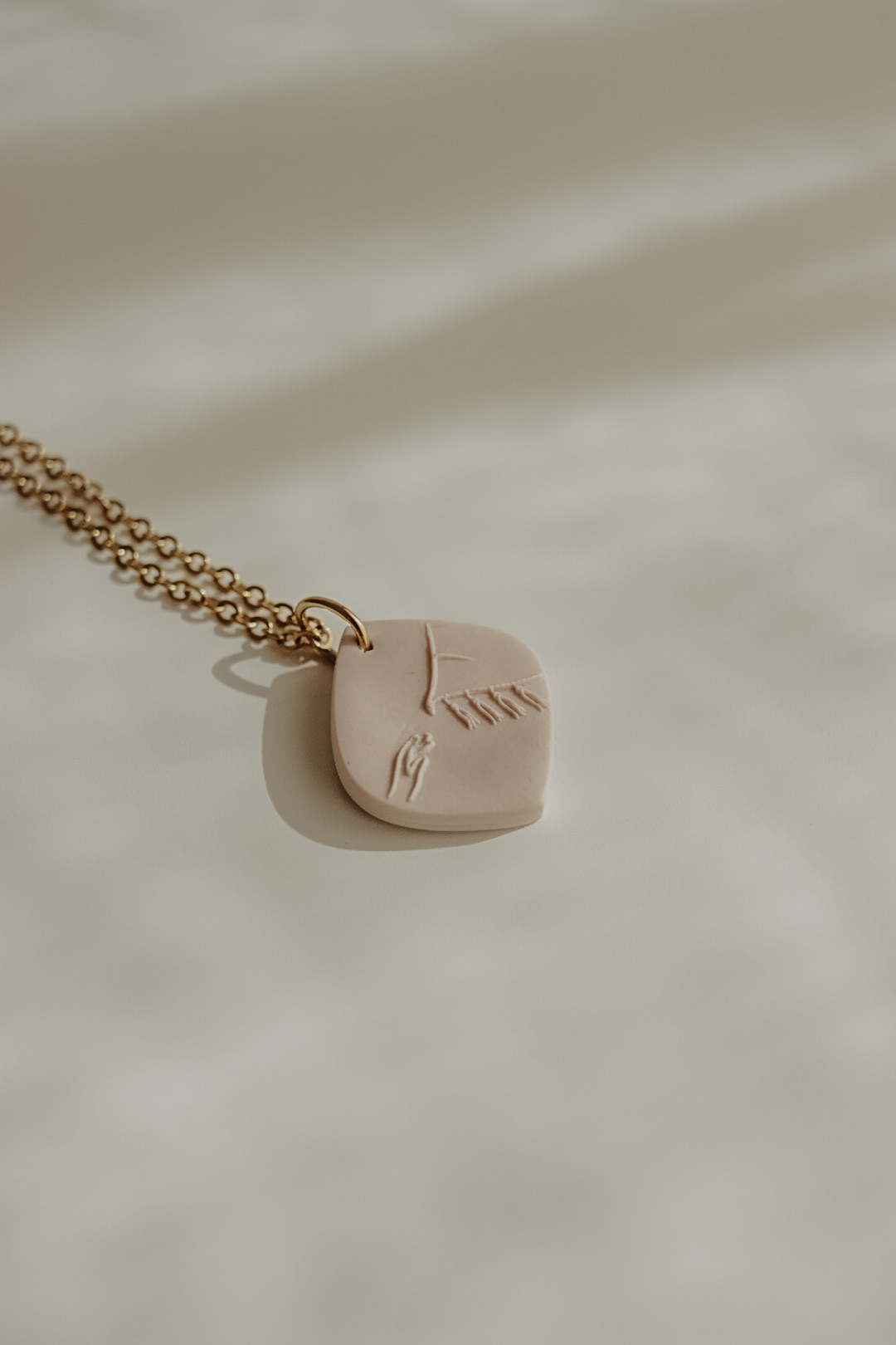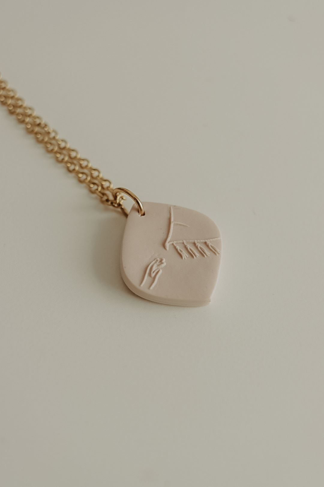 Este pendente tem cerca de 20mm de altura e está disponível em três cores. Numa das faces tem a imagem de uma mão a tocar as franjas de um manto, na outra face tem a respetiva referência bíblica.