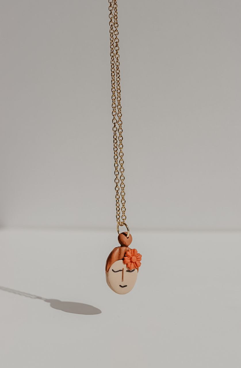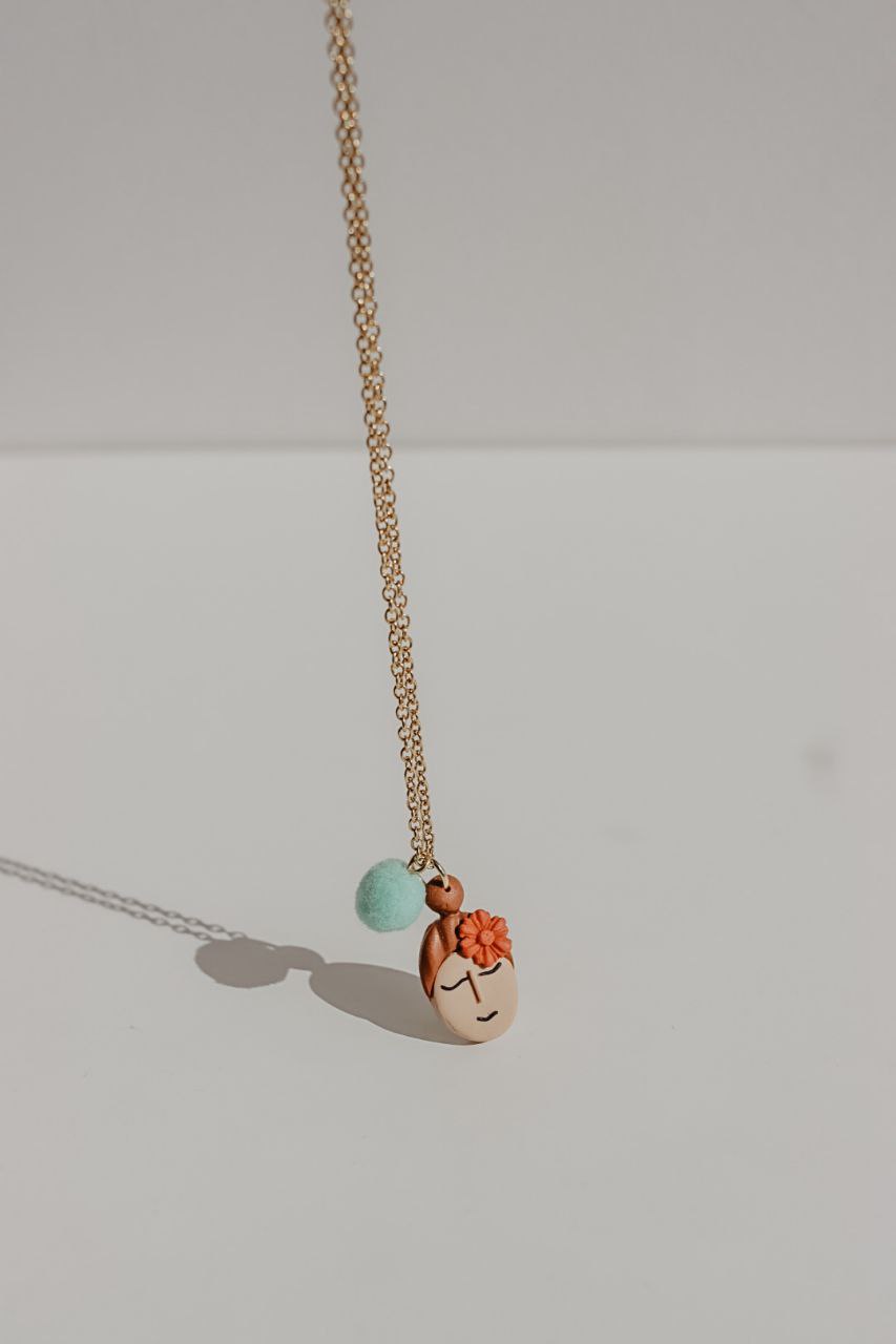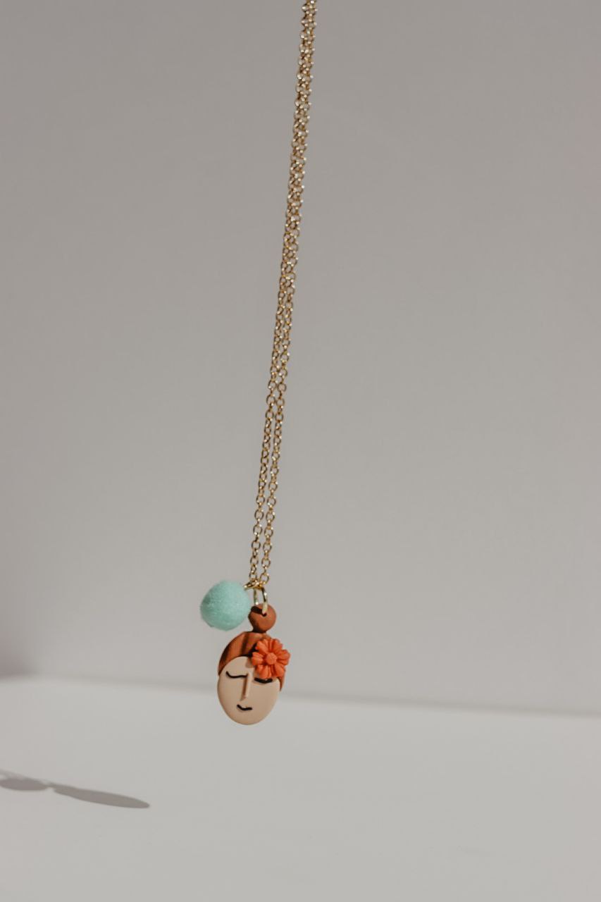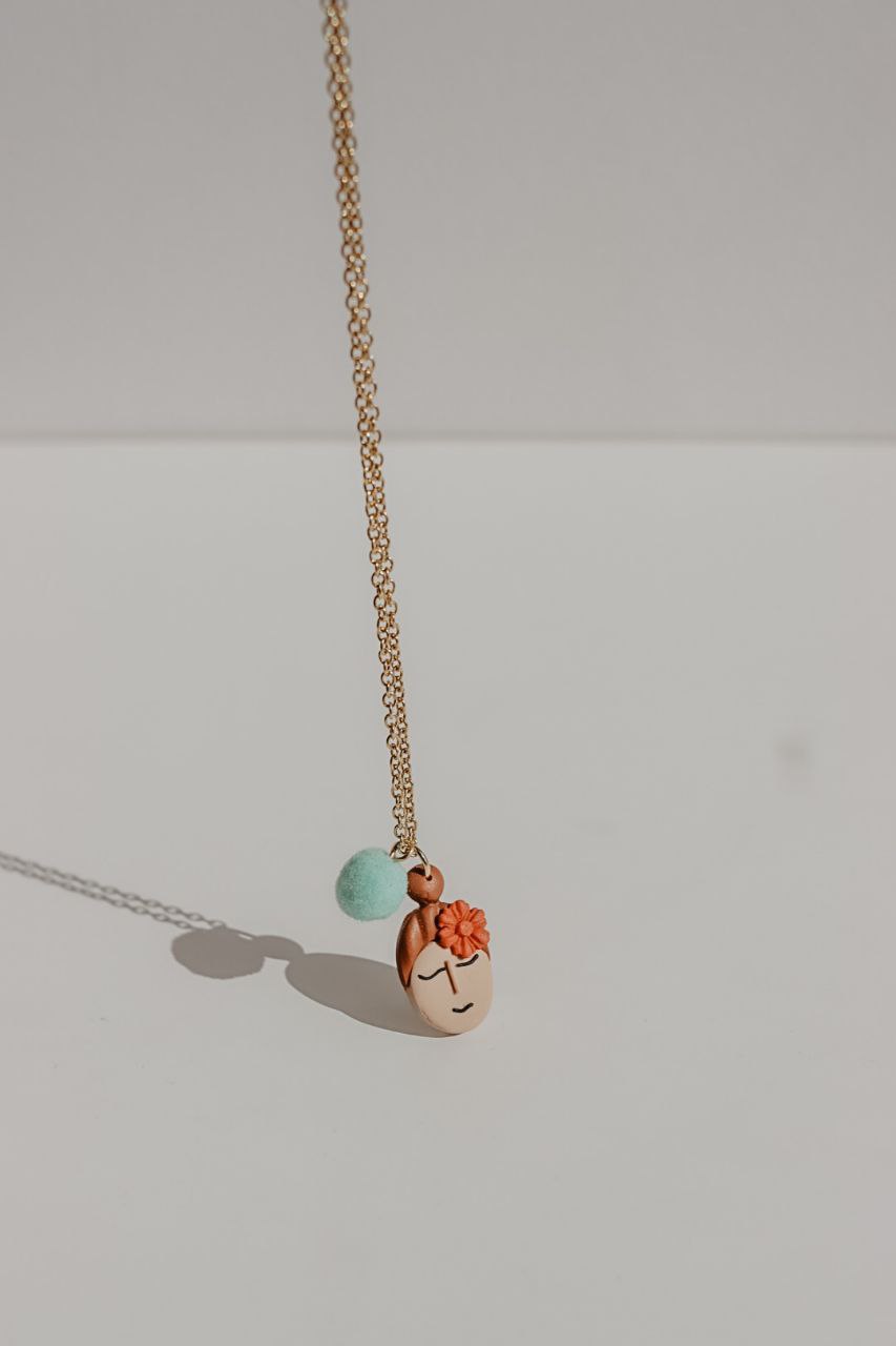 A peça inclui o pendente do rosto feminino e uma bolinha verde-água, em algodão.