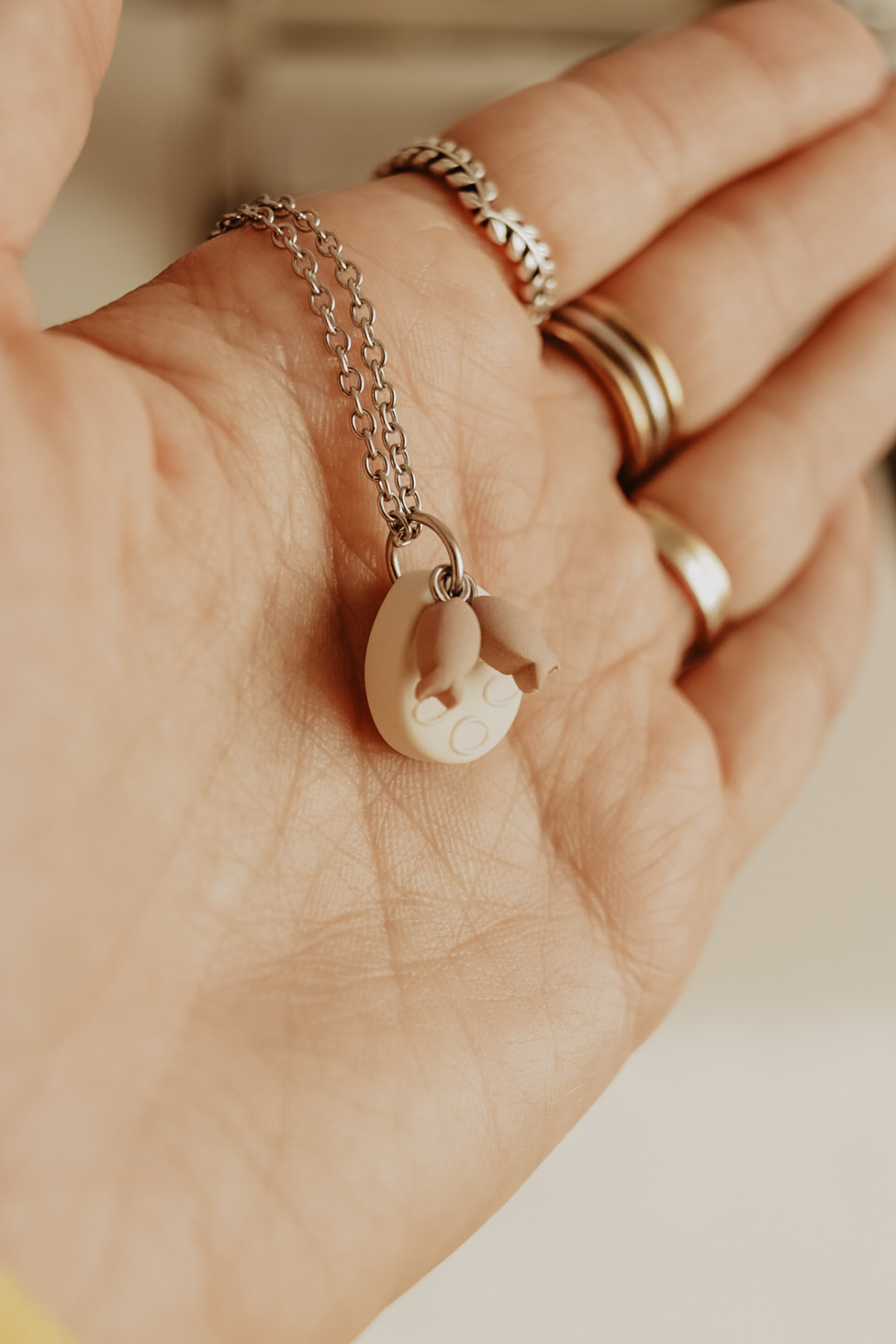 Colar prateado com pendente branco e duas pequenas figuras na mão de pessoa com anéis