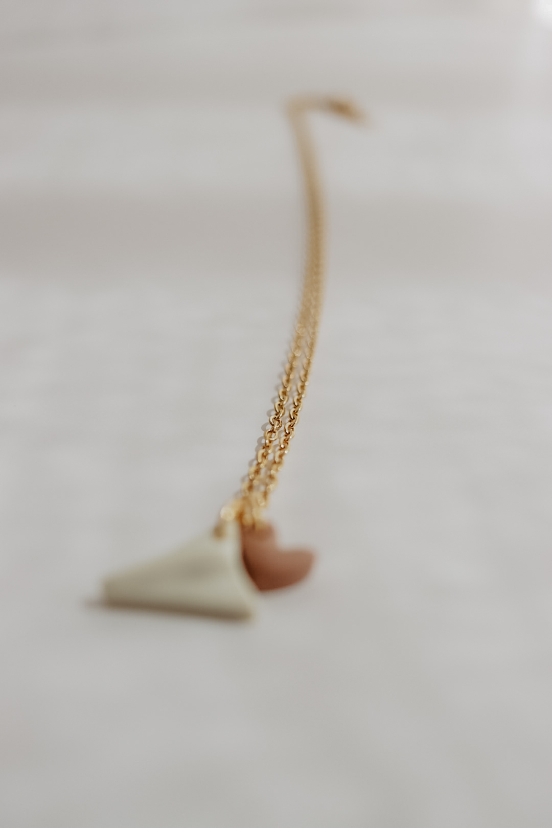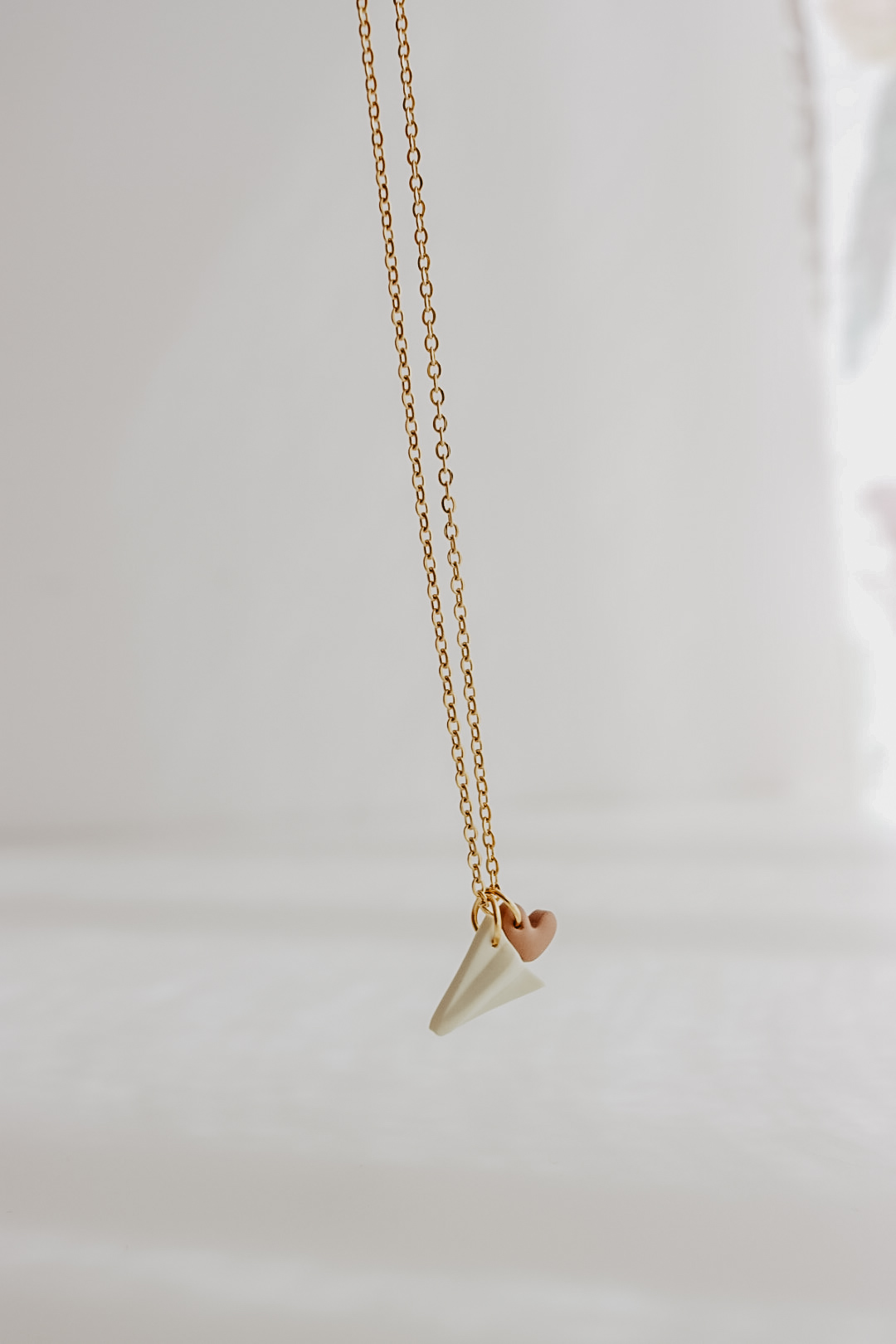 Este avião de papel foi pensado por ser um elemento ligado ao imaginário e às brincadeiras infantis. É acompanhado de um segundo pendente em forma de coração.