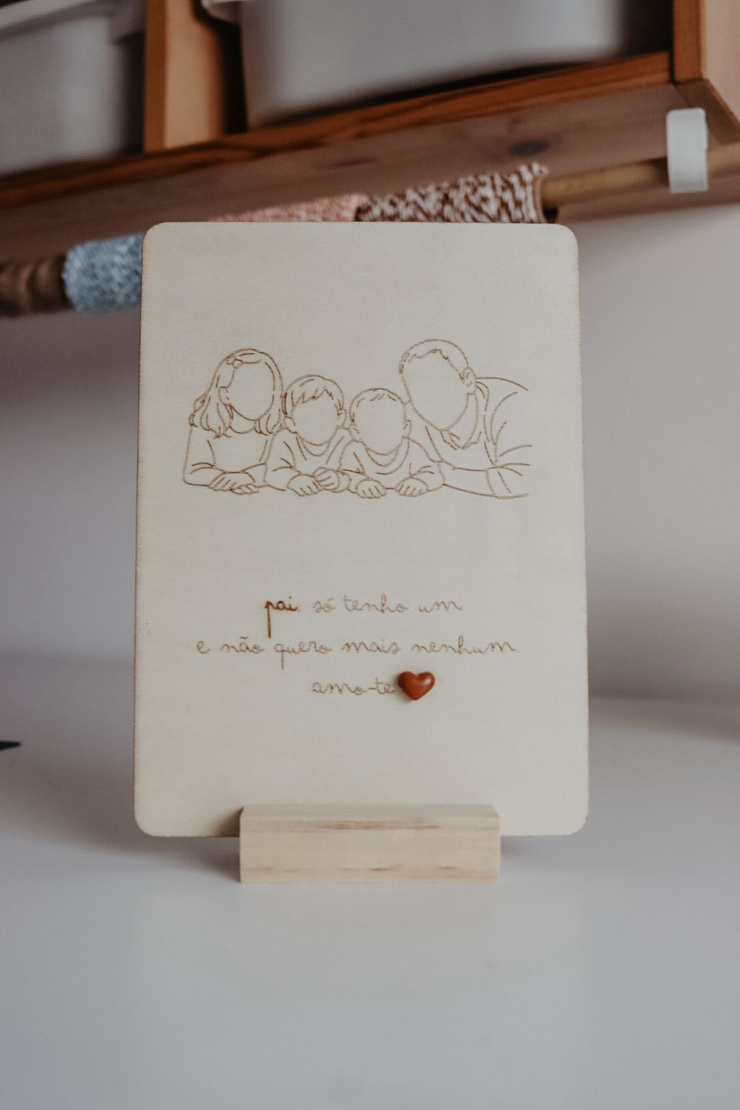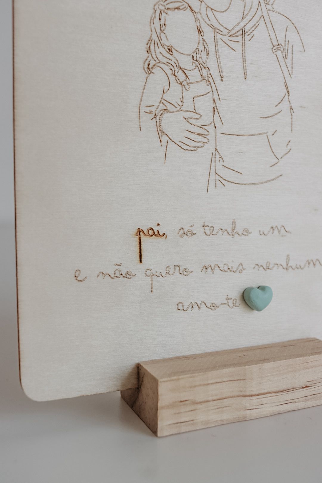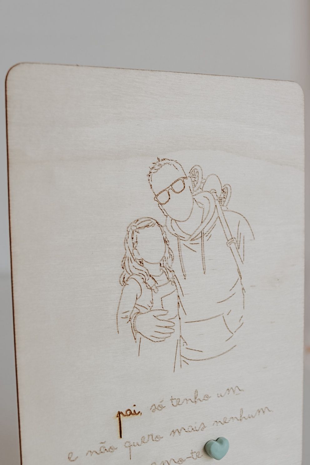 Esta placa em madeira é criada a partir de uma fotografia, que será cuidadosamente convertida numa ilustração minimalista e gravada a laser sobre madeira natural. É possível adicionar uma frase, um nome, uma data ou uma pequena dedicatória. Ideal para celebrar o Dia do Pai, da Mãe, avós, aniversários, nascimentos ou eternizar uma memória importante. Contém também um coração que está disponível em 12 cores diferentes.
